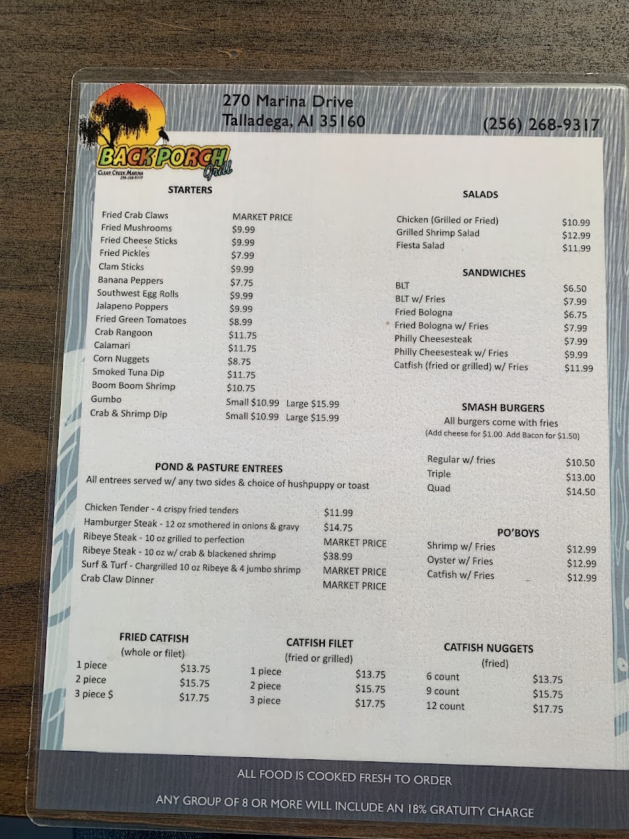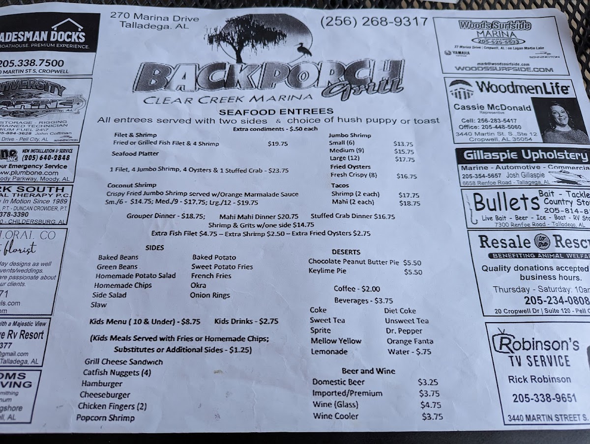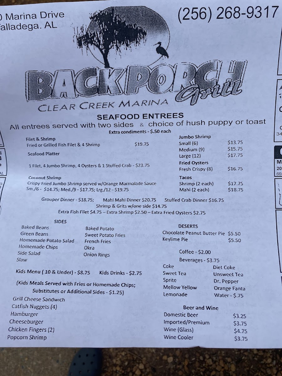 Welcome to The Back Porch, a delightful bar and grill nestled along the serene shores of Logan Martin Lake in Talladega, Alabama. This charming eatery is celebrated for its inviting atmosphere and diverse menu, perfect for families and casual diners alike.